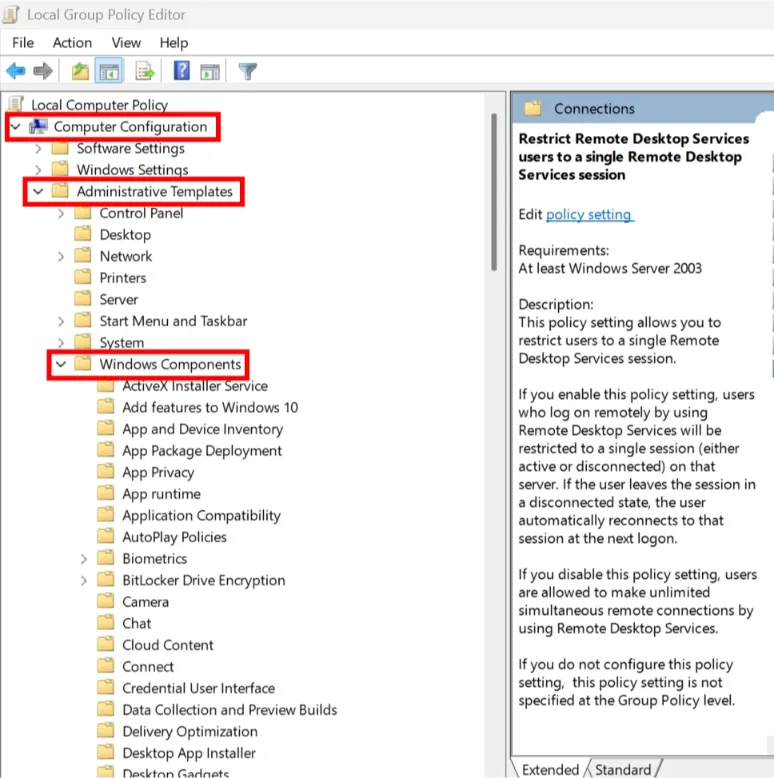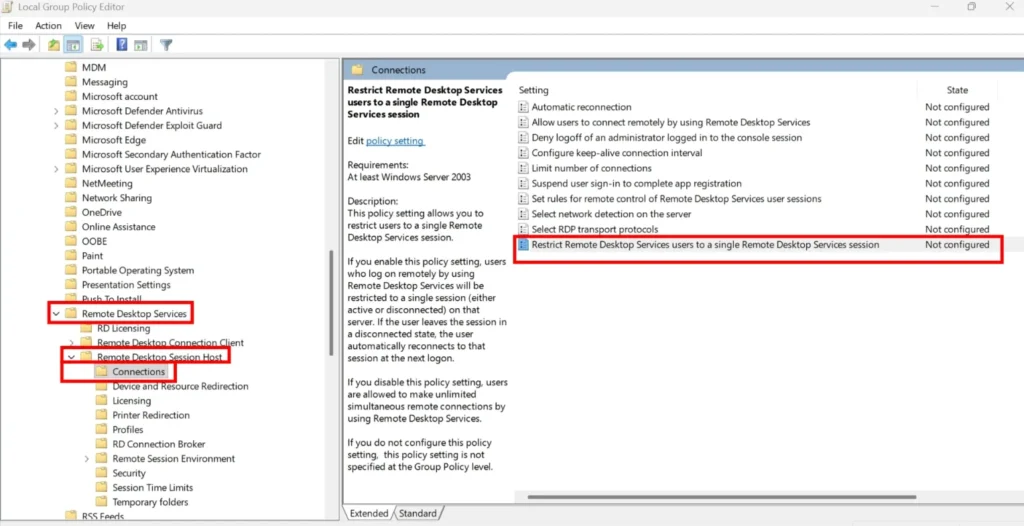3. ไปที่ Computer Configuration > Administrative Templates > Windows Components > Remote Desktop Services > Remote Desktop Session Host > Connections (ตามรูปด้านล่าง)