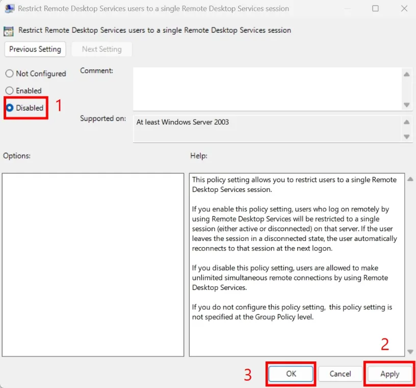 4. เปิดรายการ Restrict Remote Desktop Services users to a single Remote Desktop Services session